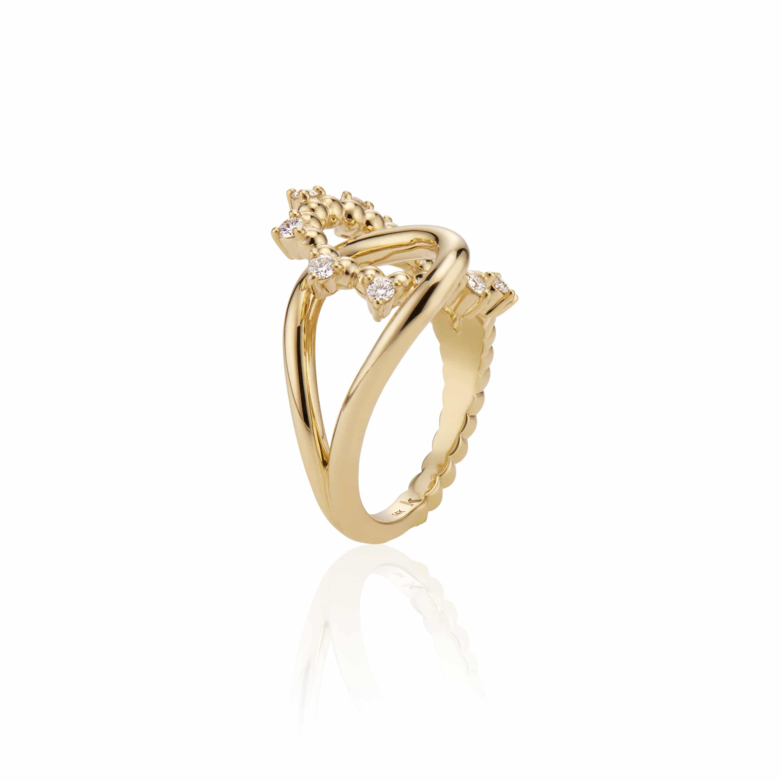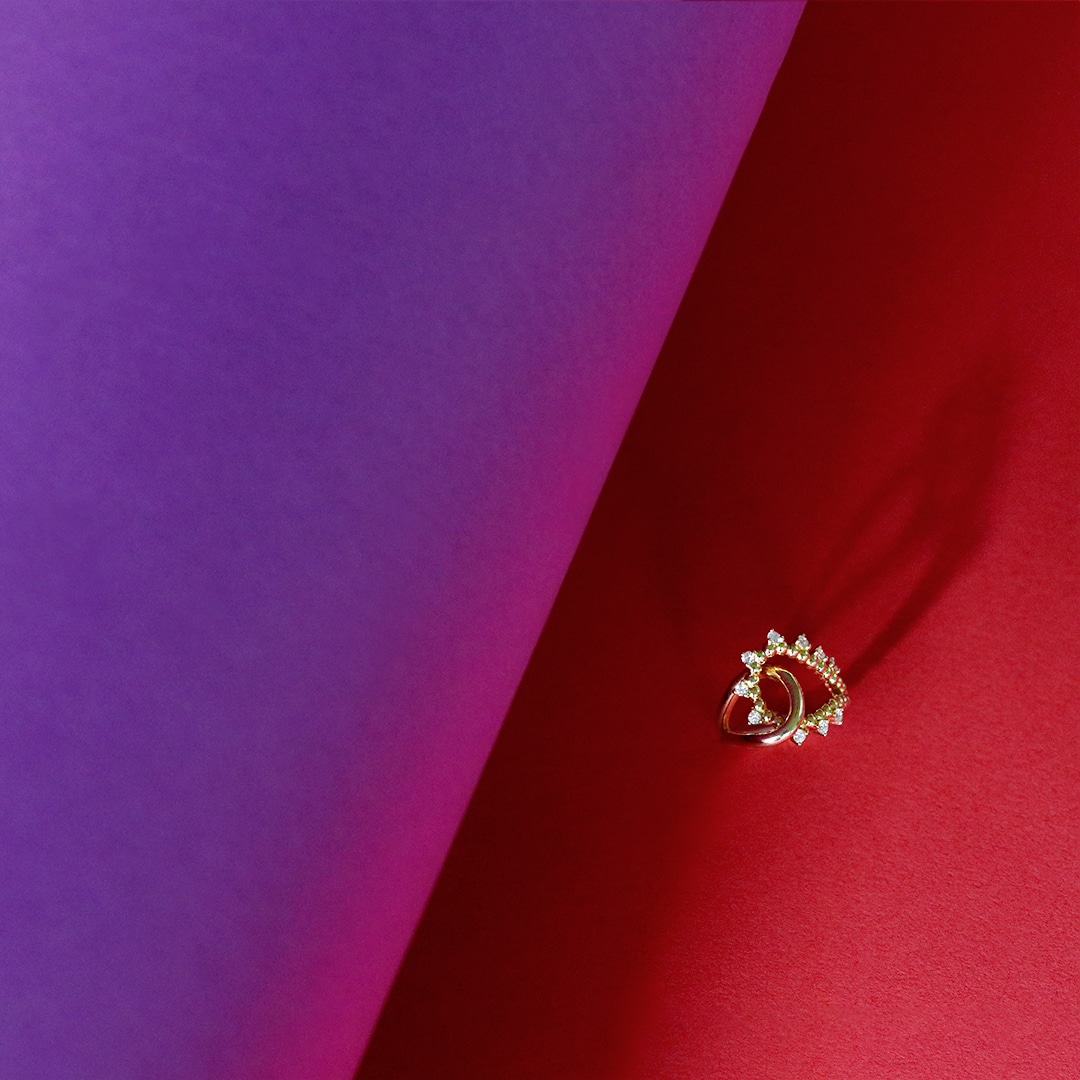 Symbolizing boundless and everlasting love grounded in connection, the interlocking infinity ring is a contemporary and asymmetric form. In 18k Fairmined yellow gold with Canadian origin diamonds (0.4 ctw) and available in yellow, rose or white gold.